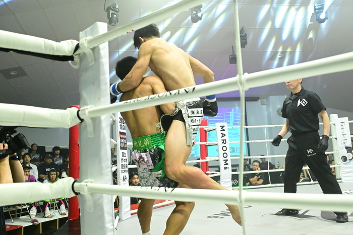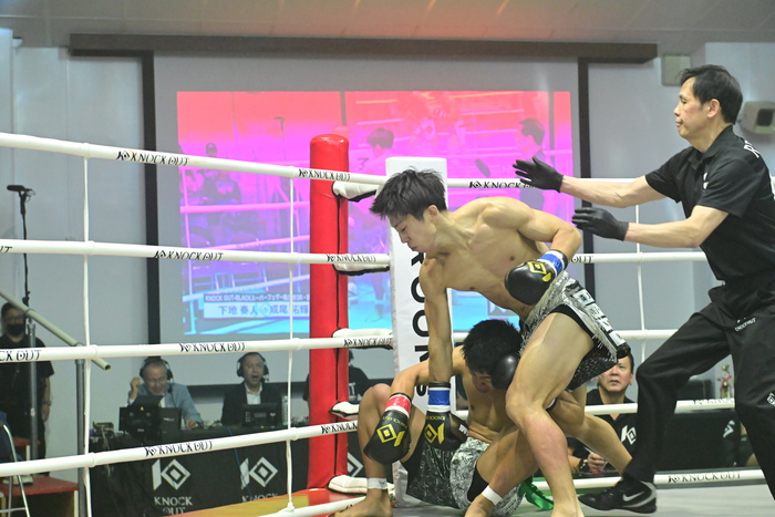 2R、右カーフを蹴る下地だが、成尾はすぐにワンツーで襲い掛かり、バランスを崩した下地に飛びヒザ蹴り。圧を強める成尾が右ストレートからまたも飛びヒザ蹴りでダウンを奪う。
