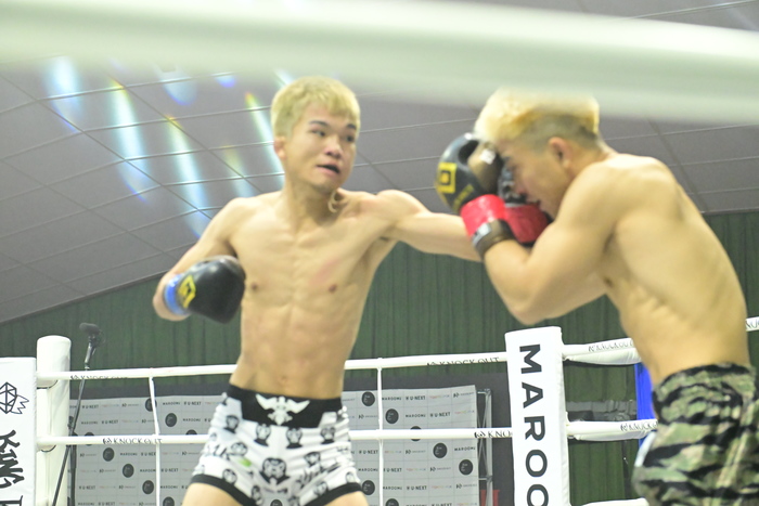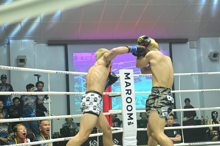 1R、サウスポーの茂木が左インローと左ミドルで先制、前に出ると左ハイを放つ。戦闘員は右ロー、ジャブ。戦闘員の右ストレートに茂木は左ストレート2発を返し、戦闘員はフック&アッパーのコンビネーションを放つが自分でバランスを崩す。前に出る戦闘員に茂木は左インロー、戦闘員は右ストレート、すかさず茂木が右アッパーからの左ストレートを返す。