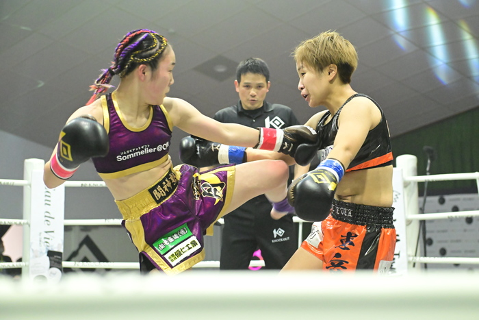 1R、いきなり前に出る堀田を右ローで迎え撃つ恵音。堀田はサウスポーから左ストレート、左ミドル、左ローを放つ。左フックで前に得る恵音に堀田が左ストレートを返してのけ反らせる。その後も強い左ストレートと左ミドルを繰り出す堀田に、恵音も下がらず左フックを打つ。堀田はワンキャッチからのヒザも使った。