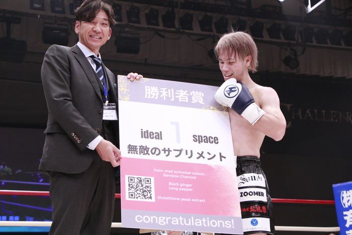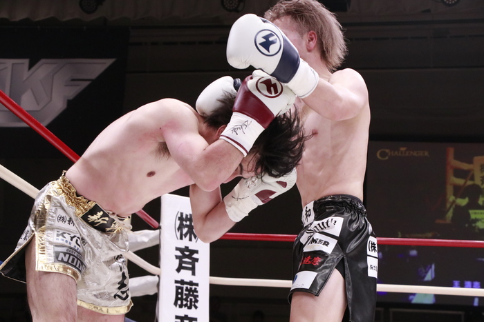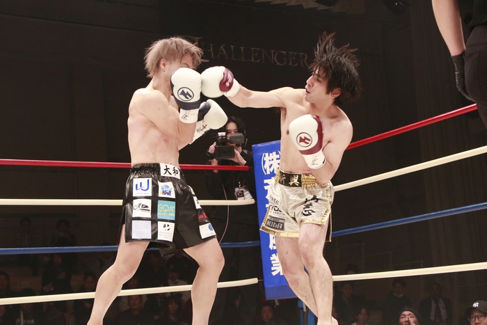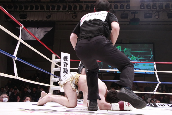 2Rになると激しく打ち合う両者。互いに左フックを狙いあう中、ボディも打つ祖根が至近距離で右フックをヒットさせてダウンを奪う。立ち上がった王だが足元がふらつき、そこでレフェリーストップがかかった。