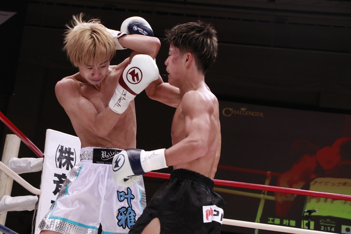2R、左ミドルを蹴る工藤は陽平が前に出てくるとジャブ、右ストレートで迎え撃ちのけ反らせる。陽平はアグレッシブに前へ出て右ローを蹴り、工藤をロープ際に追い詰めると回転の早いコンビネーションでボディと顔面を打つ。