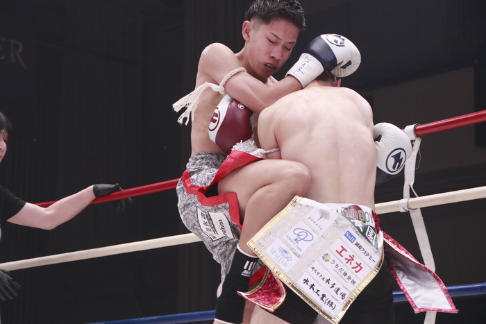 1Rから竹田が首相撲からのヒザ蹴りに持ち込み、トマトを圧倒。離れるとロー&左右フックで応戦するトマトだが、竹田の首相撲に捕まる。