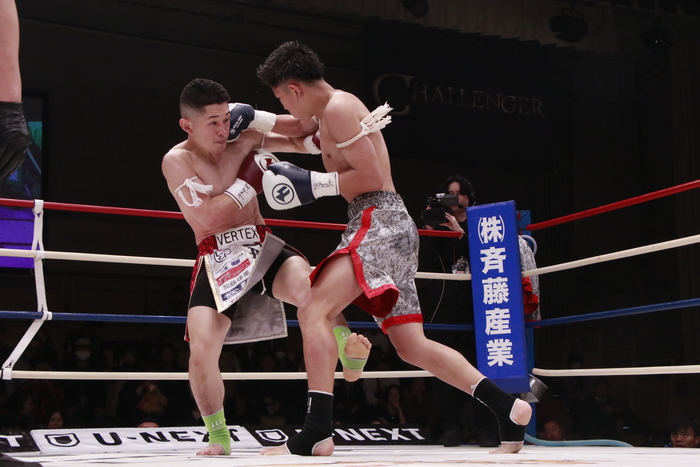 2Rは両者とも序盤からアグレッシブ。竹田は右ロー、左右ミドル、ヒザ蹴りと次々技を繰り出す。トマトは左右フックで応戦するが手数が違う。オープンスコアは20-18×3で竹田。