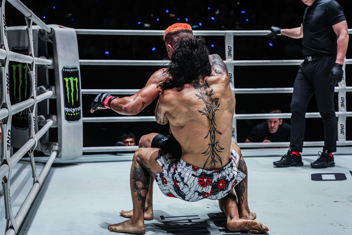 4R、前に歩くバータルフーに首相撲ヒザのアンドラージ。ともにキツい動きのなか、ワンツーのアンドラージを詰めたバータルフーがコーナーに押し込みクラッチして引き出し、テイクダウン。さらにバック狙い。落とそうとしたアンドラージにニアマウント。左足をかけて自陣コーナー際でリアネイキドチョーク! アンドラージがすぐにタップした。