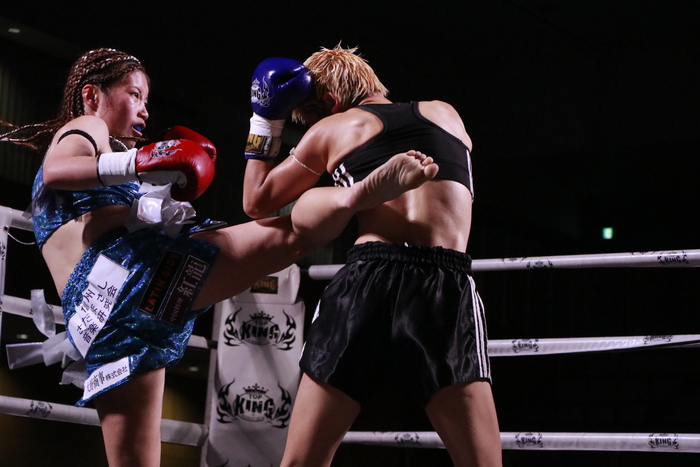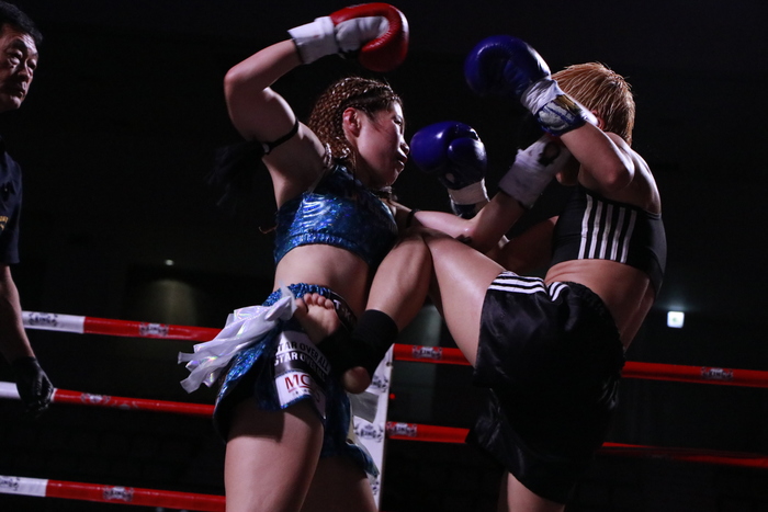 2Rも前に出るmiyUを左右ミドルで迎え撃つイツブン。miyUは距離を詰めてパンチを連打しようとするがイツブンの首相撲に捕まる。