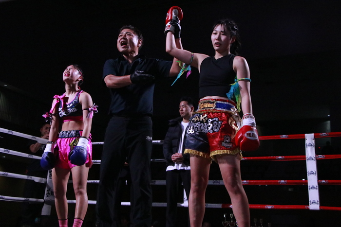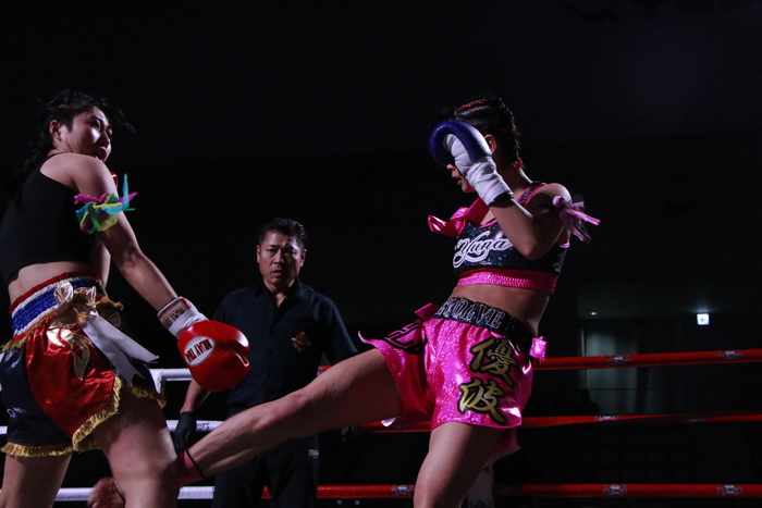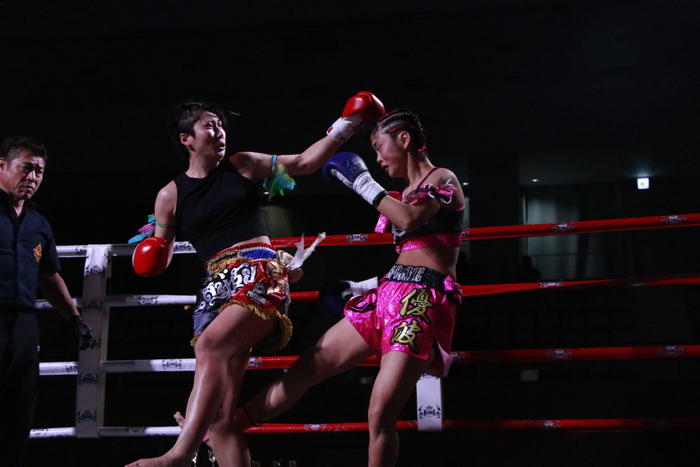 1R、サウスポーの真秀は左ミドル、優波はスネでカットしてパンチへ。両者とも打撃から首相撲に移行し、ヒザを蹴り合う。