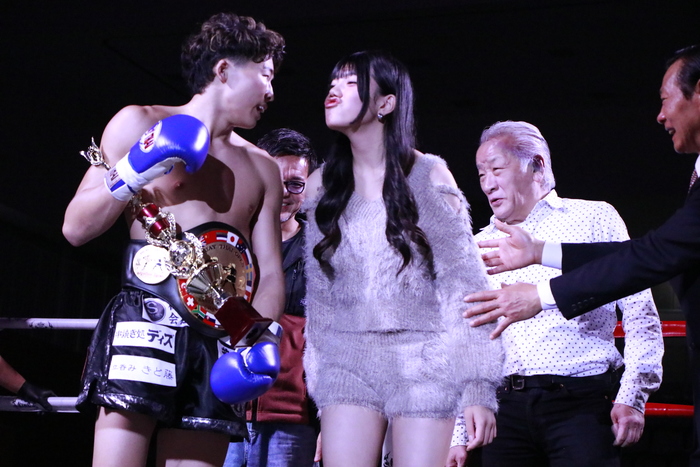 蒔が勝ち名乗りを受けると、リングインしたのはこの日、ラウンドガールを務めていた女性。蒔と固く抱き合って共に勝利を喜ぶと、“祝福のキスをしようか?”とばかりに唇を突き出す。その後も一緒に記念撮影に収まるなど、もしや蒔の恋人だったのかと思いきや…。