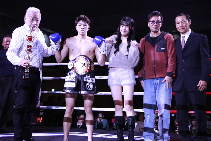 マイクを持った蒔は、「僕一人ではこのベルトを獲ることはできませんでした。僕に協力してくださる皆さん、ありがとうございます」と、ジム関係者や応援団にお礼を言うと「今日、ラウンドガールをしていた妹もよろしくお願いします」と、実は妹だったことを明かした。