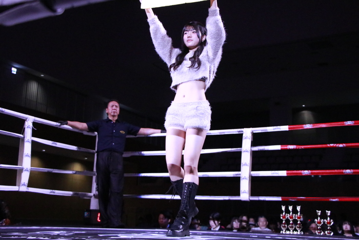 リング上で蒔(左)に抱き着き、その後もずっと寄り添っていたラウンドガールは…