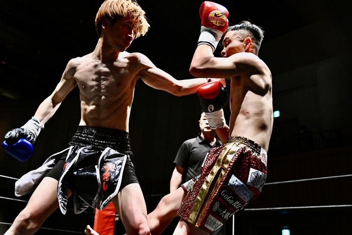 1R、吉角は右ローを中心に蹴っていき、藤原は前蹴りと右カーフ。藤原の左ミドルをキャッチして右フックを連打する吉角。藤原は右ロー、左ミドル、左前蹴り。藤原はジャブを伸ばし、ヒットを重ねる。