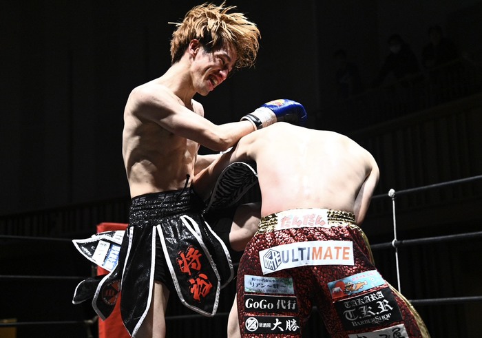 4R、ジャブを伸ばす吉角に藤原もジャブを突く。吉角は右フック。ワンツーで前に出る藤原に吉角は右フックも後退する場面が目立つ。前に出て右ストレートを打つが、すぐに藤原が返してくる。藤原は首相撲に持ち込む。