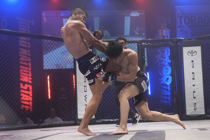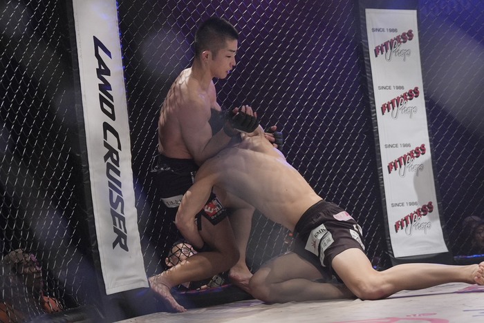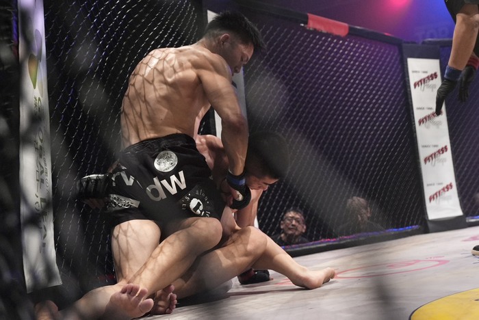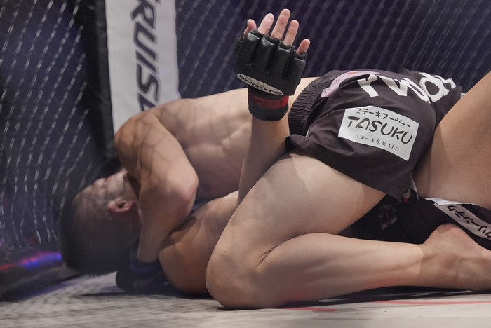 2R、サウスポー構えの奇天烈にオーソから右で飛び込む松岡。奇天烈はカウンターを狙う。両手を広げて構えた瞬間にダブルレッグら押し込みテイクダウンの松岡、すぐにサイドを奪い細かいパウンド。