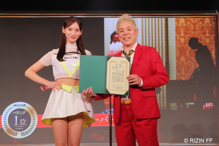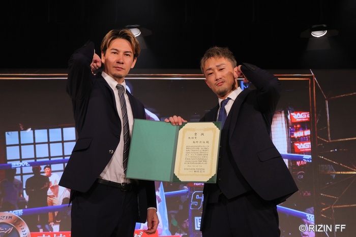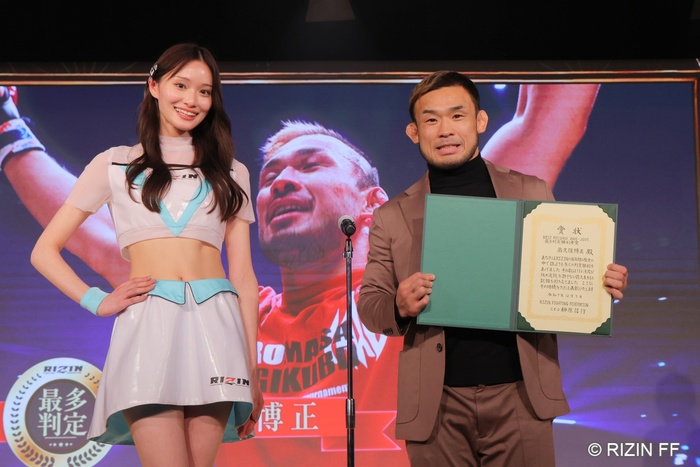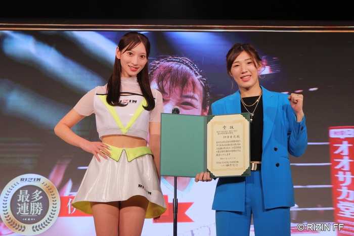 伊澤は「久しぶりに賞状をもらって凄く嬉しいですね。最多連勝賞ということで今まで無敗でずっと勝ち続けているので、このままRIZINの10周年、20周年、どんどん歴史を自分の勝利と共に増やしていけるようにこれからも頑張っていきたいと思っています」と挨拶。