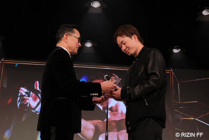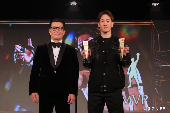 笑顔で登壇した朝倉は「こんな素晴らしい会だと聞いていなくて、僕だけ私服で来てしまいました(笑)。10周年ということで、僕たち兄弟って多分8年目ぐらいですかね。最初RIZINが始まった時はアウトサイダーにいて、地上派で凄い大会やってるなっていう風に凄い嫉妬して出たいなっていう中でようやく出れて。出たはいいんだけど、次はなんか総合格闘技の認知が世間であまりなくて。で、YouTube始めて。数えたら18戦今してるってことで、多分死ぬ時に思い返しても僕の青春だったなって思います。本当にこのMVPという素晴らしい賞をいただけてとても嬉しいです。ありがとうございます」と語った。
