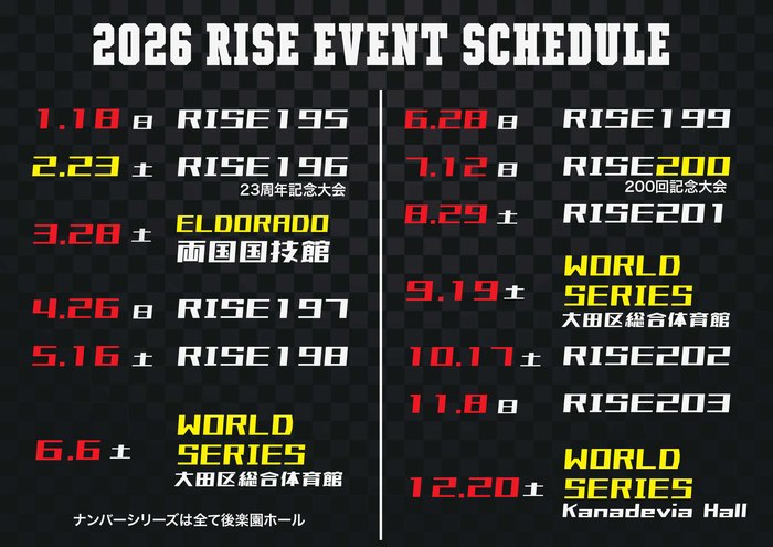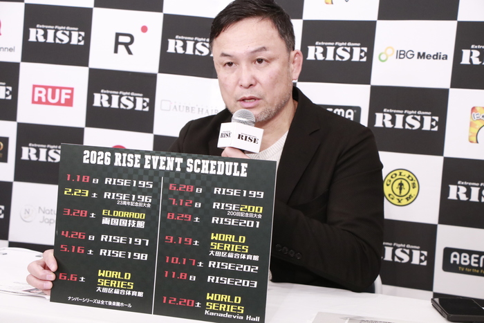 また、2026年の年間スケジュールも発表。後楽園ホールのナンバーシリーズが9大会、ビッグマッチの『ELDORADO』は3月28日(日)東京・両国国技館、『WORLD SERIES』は6月6日(土)と9月19日(土)に東京・大田区総合体育館、12月20日(土)に東京・Kanadevia Hall(TDCホール)で開催。2月23日(月・祝)の『RISE 196』は23周年記念大会、7月12日(日)にはナンバーシリーズ200回記念大会が行われる。