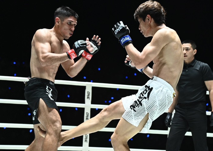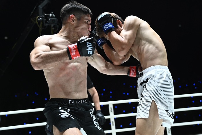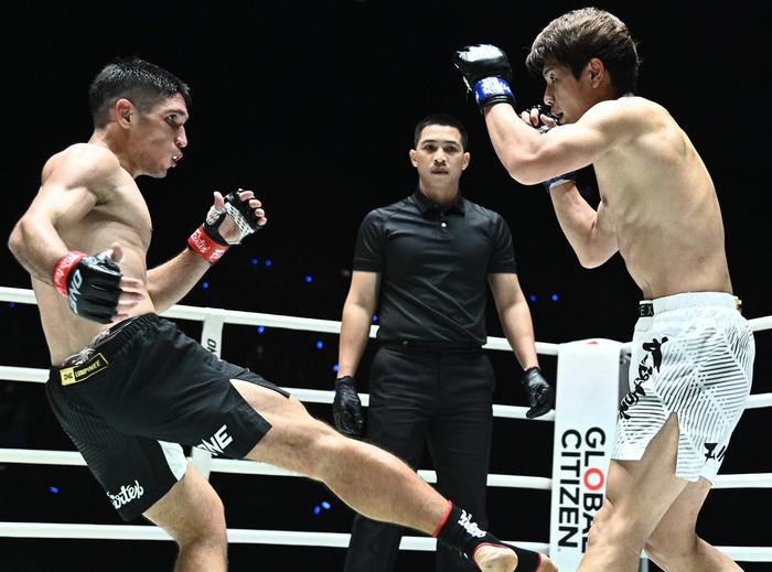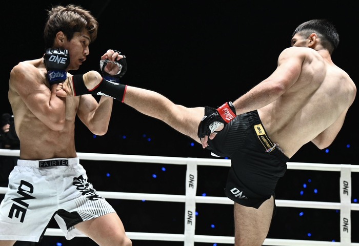 大田も右ボディストレート。圧をかける大田はワンツー、三都主はすぐに首相撲へ持ち込むが、ヒザを蹴ろうとしたところで大田が持ち上げて崩す。今度は大田が首相撲に持ち込むと、ヒザを蹴って大きくコカした。