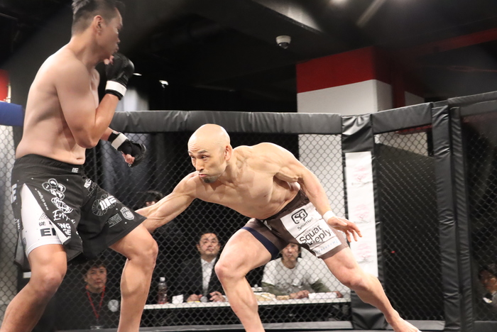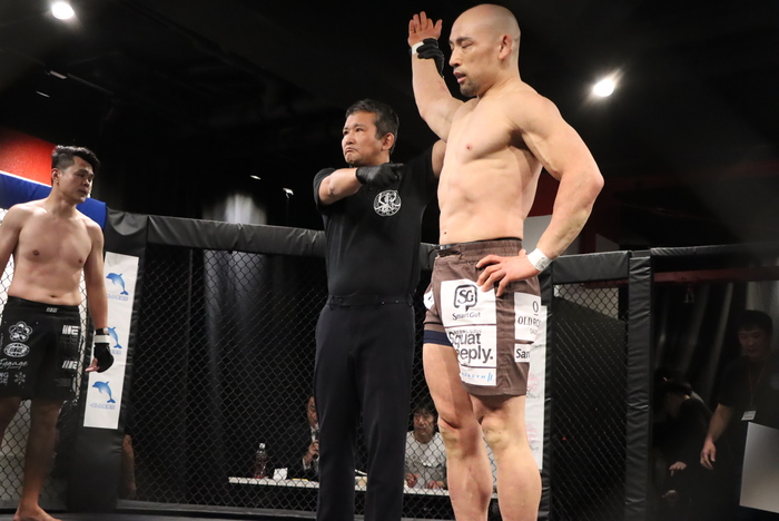 素手の山田に、オープンフィンガーグローブのカイ・チー。サウスポー構えの山田はケージに詰めてダブルレッグテイクダウン。ハーフガードの山田にセコンドは「ハーフでいい」と声。山田はヒジ打ちで削りながらパスしてカイ・チーを寝かせると右で脇差し、左ヒジ連打でタップさせた。