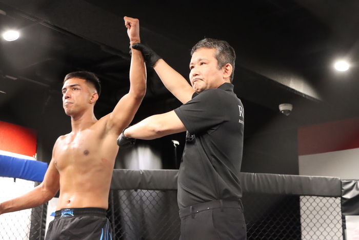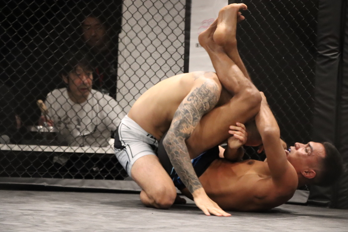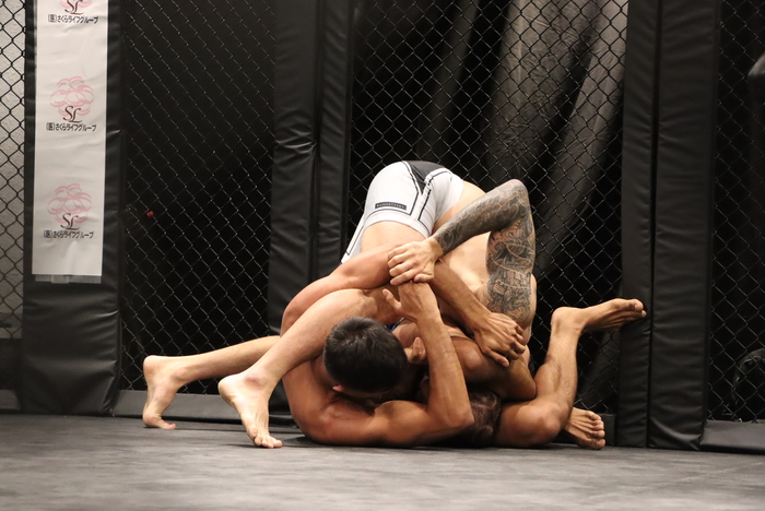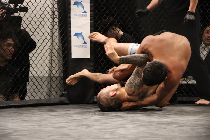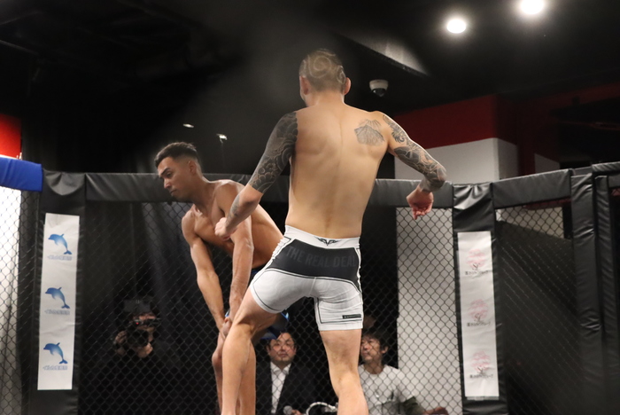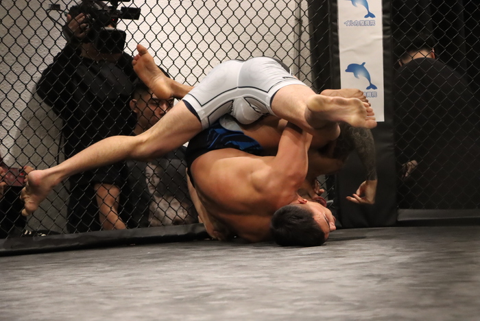 サウスポー構えの松本は左の前蹴りを金的周辺に効かせると、メネギンは引き込みクローズドガード。そこに松本は頭突き、下のメネギンは腰を切り、ケージを蹴ってスイープ。