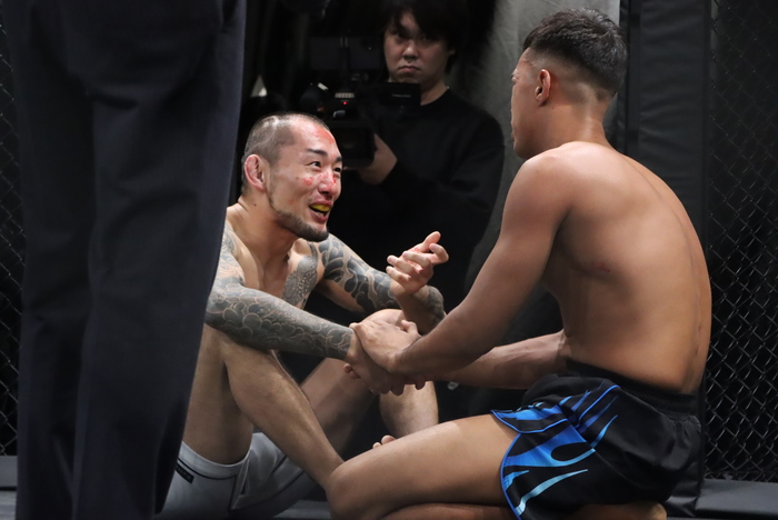 三角からのヒジはセコンドが言ってくれたので。練習で人にはできないし。(楽しかった?)楽しくはないですね。本当に最初はやっぱり人を殴れないですね。僕ずっと柔術をやってきたんで、人、殴れないじゃないですか。松本さんがパンチ何個も入れてくれたんで、入れられたと思います。それがなかったら三角で極めに行こうと思ってました。またパンチ来るなと思って足を組み直して、これで極まりましたね。それで足をすくって。やっぱ松本選手はめっちゃいい人なんで、血も出てるの見てあんまり嬉しくなかったですね。