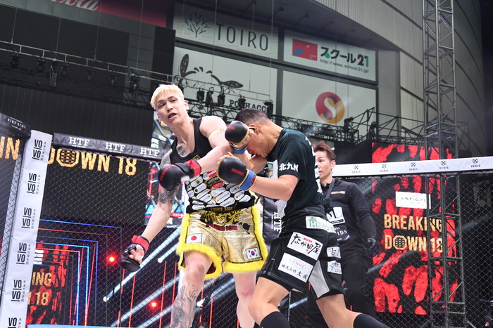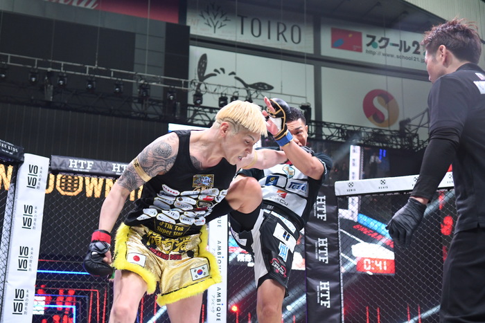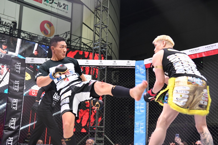 1R、ローを蹴る誠に傾奇者は左右フック。両者とも手数があまり出ずに終了。ローを蹴っていった誠の勝利となった。