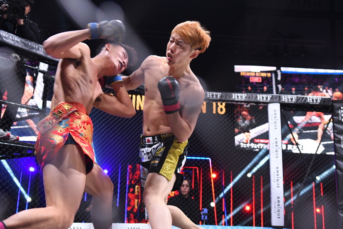 ウェイヤンの右フックにはヒザを合わせる井原。しかし終盤、ウェイヤンのワンツーがヒット。すぐに井原がワンツーを打ち返していく。