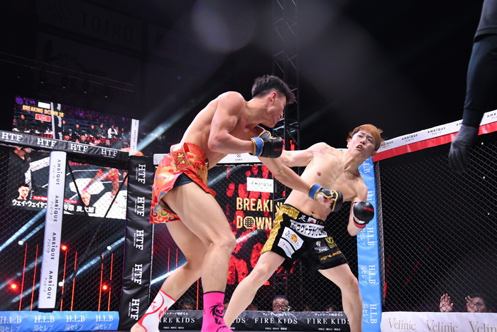 ウェイヤンが強い右ミドルから右ストレート、左フック。井原も右ストレートで打ち合いに行き、右フックでウェイヤンを下がらせる。井原がワンツーでケージ際に追い込む。