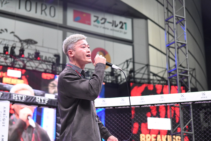 「昨日の前日記者会見で江口に叩かれて。自分、北海道の雪の影響で減量もクリアしたけれど体調的に優れてなくて、普段なら絶対に倒れないけれど体調が優れない中で。ああいう風になると江口ばかり悪く思われてしまうかもしれないけれど、あそこは俺がもらう想定でいれば倒れなかったので。油断していたので試合できなくなったところなので。どうですか皆さん、江口をぶっ倒すところ見たくないですか。リングの上でやるのが男だろ。次回大会でもやれんだろ。俺は絶対にこの上でアイツのこと締めてやるので、今日は楽しんでいってください」