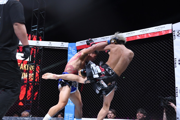 右ストレートの相打ちからパンチを出しながらどんどん前へ出てくるズンイェン。野田は相打ち、飛びヒザを狙うがズンイェンの突進は止まらず、押されて転倒を繰り返す。