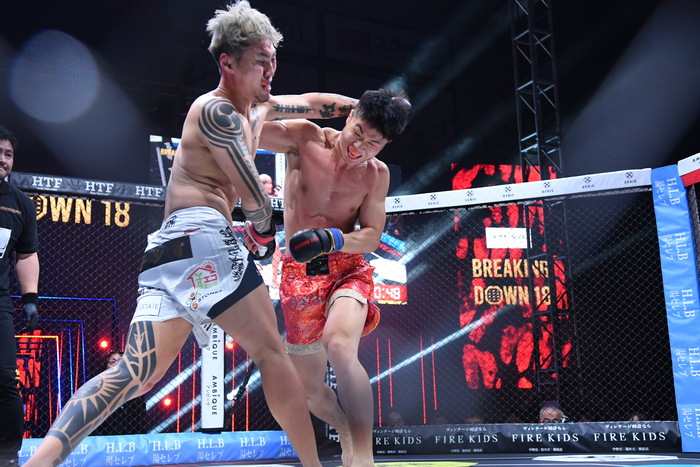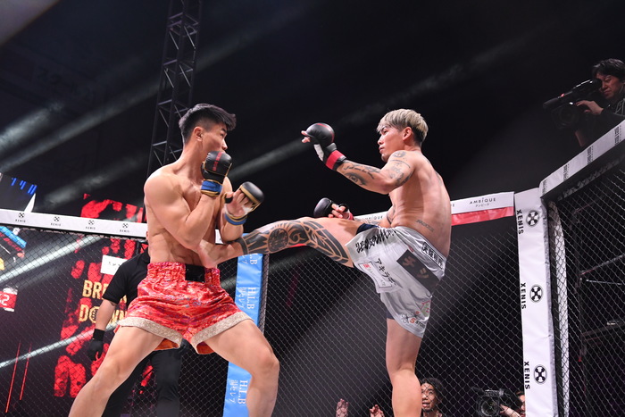 判定は0-0のドローで延長戦へ。右フック、ワンツーで前へ出るシャンミンに、シモミシュランも左ストレートで応戦するが、組んでの膝ではシャンミンが優勢。身体の圧に押されるシモミシュランは左フック、右フックを浴びる。