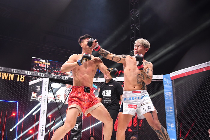 前蹴りを連発するシモミシュランにシャンミンは右フック。シモミシュランの左ローに転倒しそうになったシャンミンはダブルレッグで組み付く。両者立ち上がると打ち合いになるが、シャンミンの身体の圧とパワーが明らかに上回っていた。