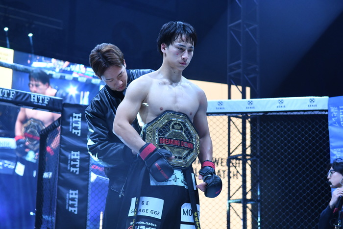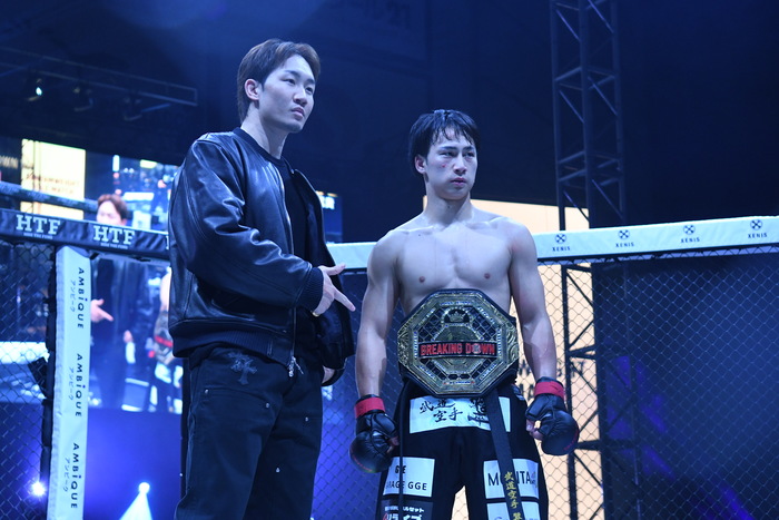 判定は5-0で大野の勝利に、初防衛に成功した。大野の腰にベルトを巻いた朝倉未来BreakingDown CEOは笑顔のサムズアップ。