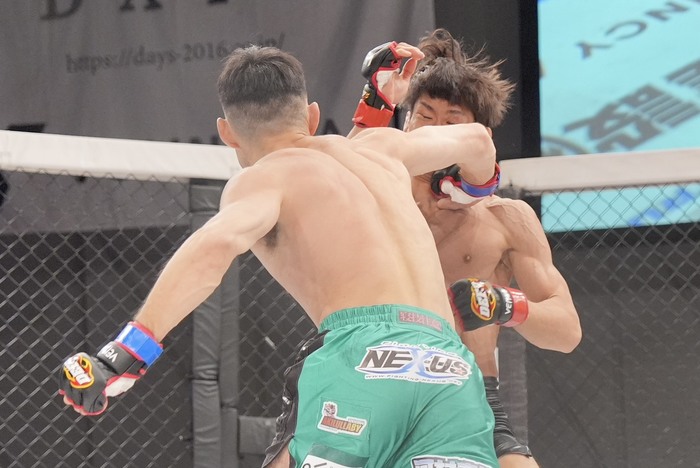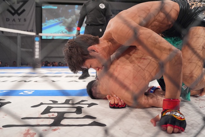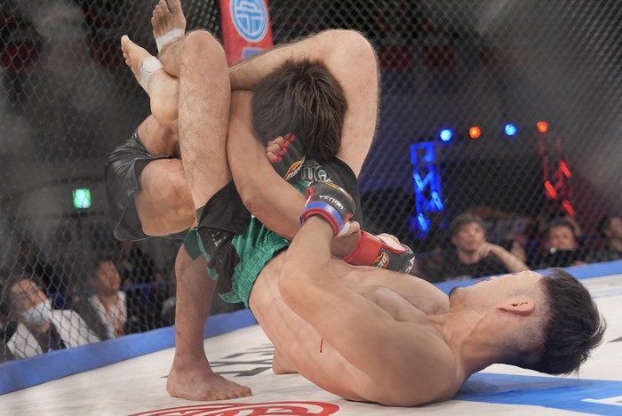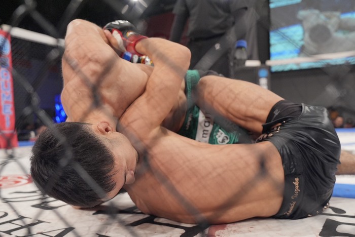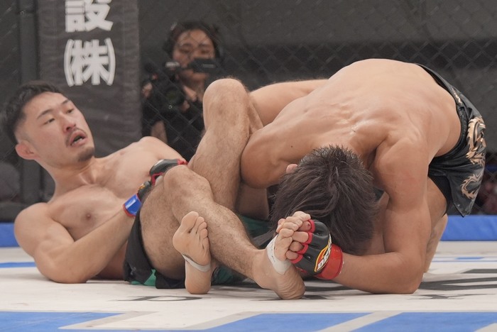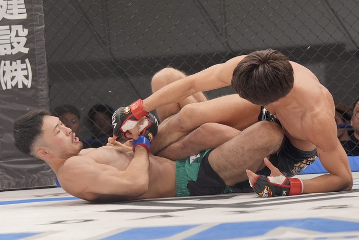 1R、ワンツーで前に出る石司に、河村はギロチンへ。頭を抜いてトップの石司。いったん離れてトップから蹴り。ブレーク。互いの右が交錯。河村は左から右を振って前に出るとクローズドガードから引き込み、インサイドガードの石司に左右のパンチ! 石司がパウンド1発落としブレーク。右で飛び込む石司に、河村はワンツーの右ストレートでダウンを奪うと、河村は外ヒール狙いもゴング。