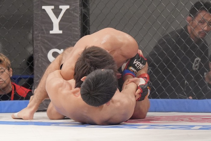2R、先にプレッシャーをかけて右を突く石司。河村のローシングルを切ってバックへ。シングルバックから右の踵を腿に突き、背後からパンチ、トップに移行。その際で首を狙う河村だが、ハーフで極めさせない石司はシングルバック、腰をずらし首を狙う河村にトップに移行。河村は下から蹴り上げ。