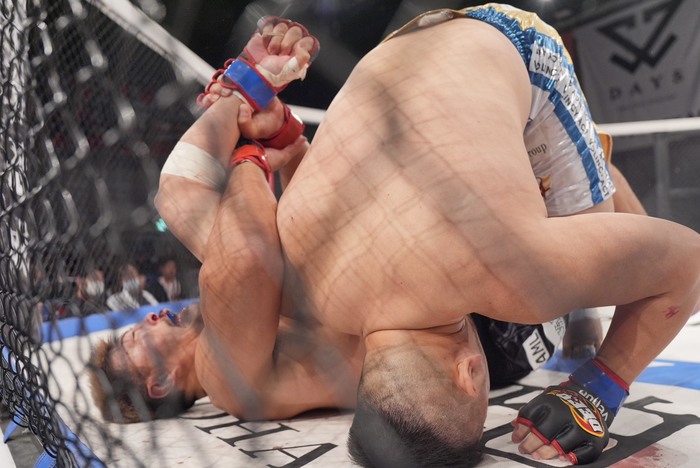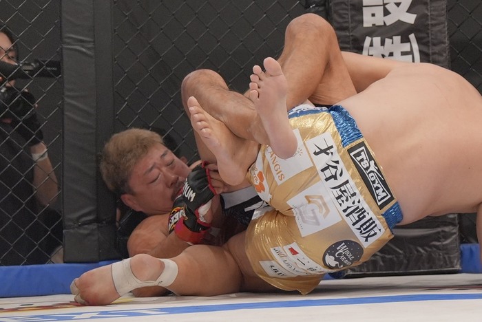 2R、鼻血の水野。またもノーモーションの左をヒットさせる水野は組んで背後につく稲田にキムラクラッチ。後方に回してトップになるとキムラロックで極めた。