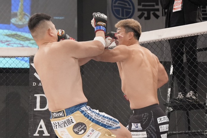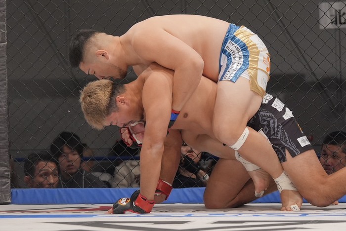 1R、サウスポー構えからノーモーションの左の水野。詰める稲田が左で差してケージに押し込む。右小手の水野に、稲田は右ヒザもローブローに。中断。