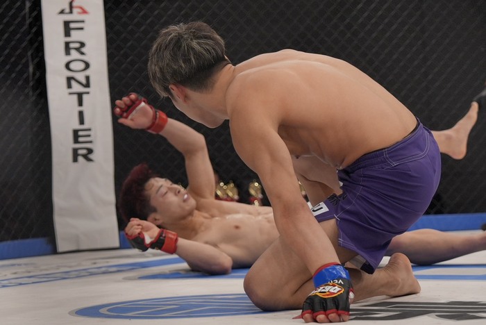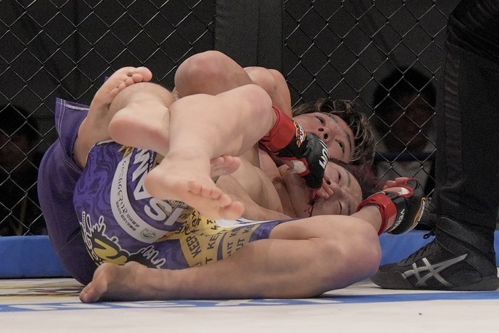 先に立ち上がった中務は、小崎の立ち上がりにバックに回り、左手を喉元に入れて同時に両足もフックしボディトライアングルに。小崎を失神させて無敗の5勝目をマークした。