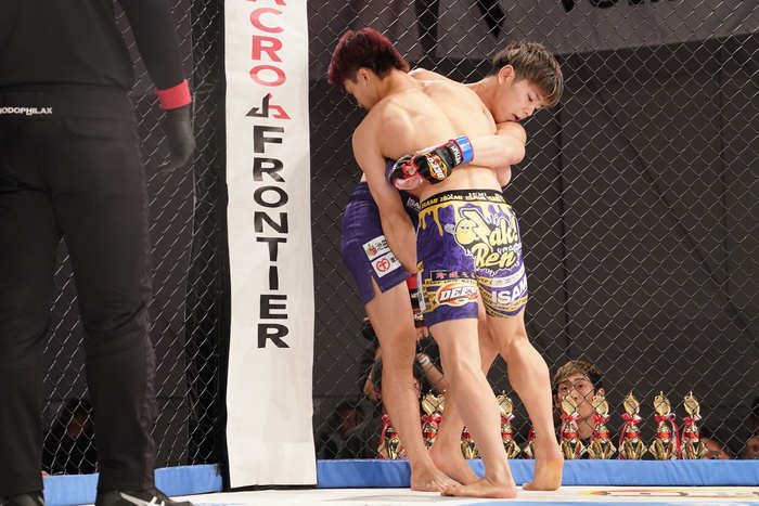 右ボディストレートから右の蹴りでバランスを崩した小崎。中務は立ち際に左右も潜った小崎が両差しでゴング。