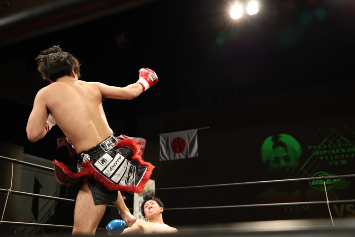 もう1つのタイトルマッチは、昨年12月にDEEP☆KICK-65kg第6代王者に輝いたTETSUの初防衛戦として、9月の挑戦者決定戦を制した大前が対峙した。TETSUは1度トーナメントで苦渋を飲むも、王座決定戦に選出され見事にTKO勝利、涙のベルト戴冠を果たしている。その後はRISE、PRO-KARATEDO達人、BreakingDownなど様々な舞台で活躍。