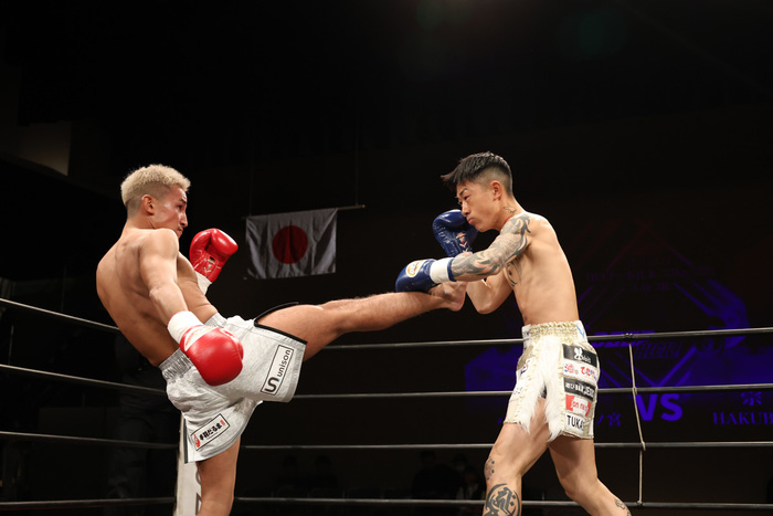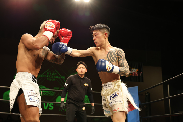 DEEP☆KICK-53kg契約、スホンと崇斗の1戦。試合は互いにカーフで削り合いながら、スホンは前蹴りにワンツー、崇斗はインローに膝と繰り出すも1Rは互角の印象。続く2R、スホンは圧を強めるもここで光ったのは崇斗の攻勢、パンチをまとめスホンにガードを固めさせたところに膝・カーフ・インローと打ち分ける展開が続いていく。スホンもストレートにフックと返すもこのラウンドは崇斗のラウンドだ、2R終了時点でのオープンスコアはジャッジ3名共に19-20で崇斗を支持する。