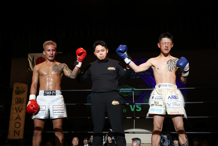 最終ラウンド、ここでも優勢を見せ勝利を掴みたい崇斗だったがこのラウンドで目立ったのはスホンだった。開始早々から打ち合う両者、中でもスホンはストレートにバックハンドブローなど明らかに手数を増やしていく。崇斗は細かいパンチから膝で2R同様にヒットを稼ぐも、スホンのパンチ・膝のヒットが目立っていく。結果、3Rはスホンの攻勢が支持され判定は0-1(崇斗)でドロー、引き分けとなった。