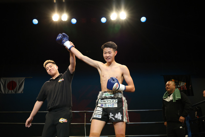 続く2R、先ほどダウンを獲られた虎太郎は早々から前に前にと踏み込んでパンチを振るいヒットを奪う。しかし加古は冷静、ワンツーに膝、ローでダメージを与えていくと右フックで1Rに続き2度目のダウンを奪う。ダメージは明らか、虎太郎も諦めず立ち上がり起死回生の一撃を狙っていくも、最後は再びの膝でTKO。2R1分38秒、ジャブに膝、ローと威力の見える技を次々にヒットさせていった加古が2RTKOでプロ初勝利を奪った。