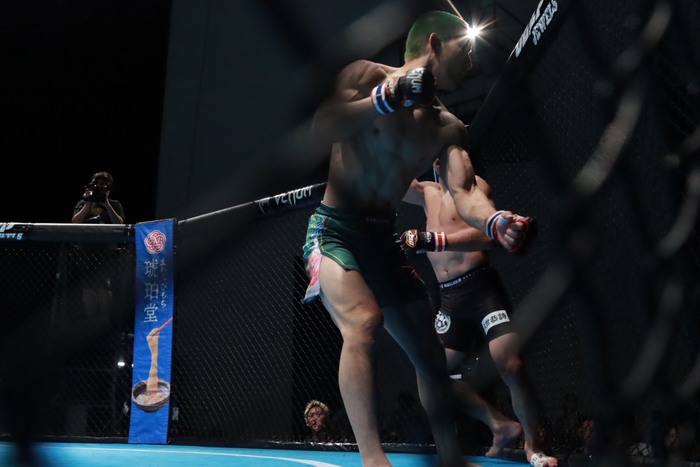 三村は右カーフ。これにバランスを崩した鈴木が立ち上がるとすぐに2発目の右カーフ。しかし圧力をかける鈴木の右がヒット。右回りにサークリングする三村。右ローを突くが、そこに右ストレートを狙う鈴木に、三村は避けるもバランスを崩す。追う鈴木のワンツーをかわして組んだ三村。