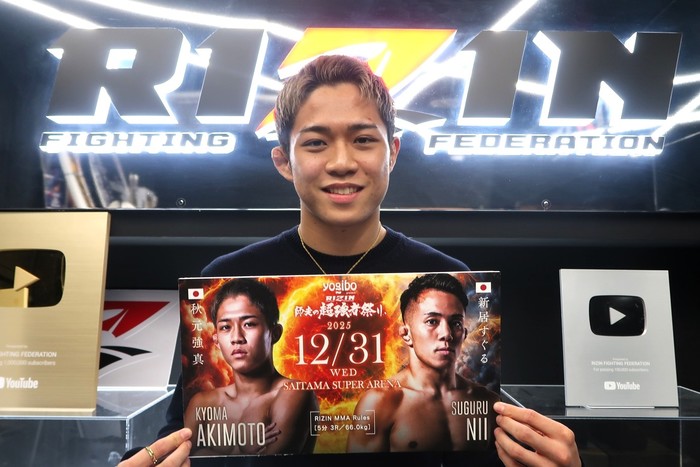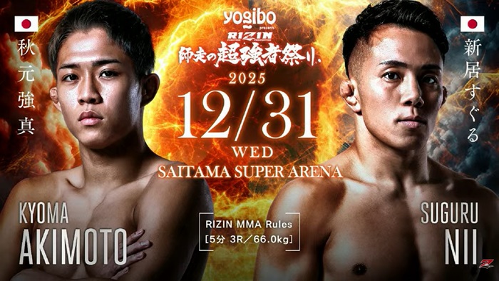 2025年12月19日(金)18時から、大晦日『Yogibo presents RIZIN師走の超強者祭り』(さいたまスーパーアリーナ)の「対戦カードに関する緊急ライブ配信」が、RIZIN FF公式YouTubeチャンネルで行われ、フェザー級で、秋元強真(JAPAN TOP TEAM)vs.新居すぐる(HI ROLLERS ENTERTAINMENT)が発表された(※下部に追記)。