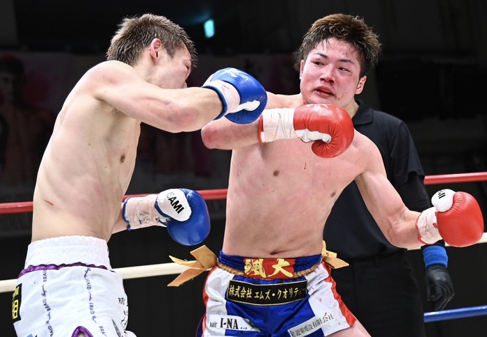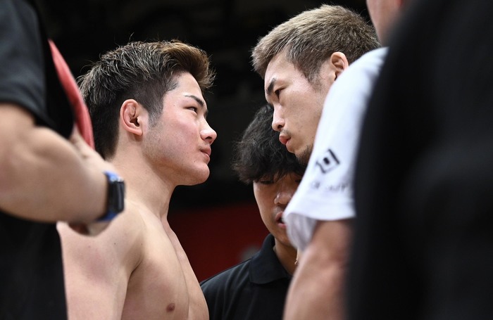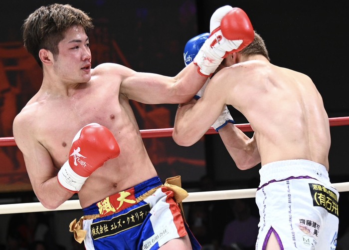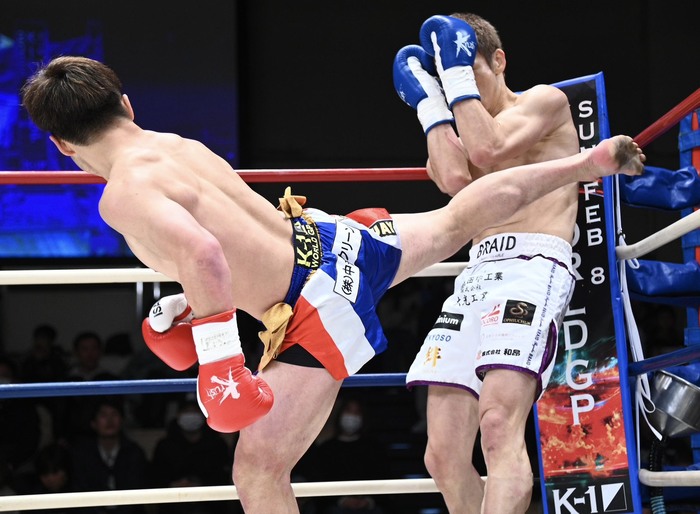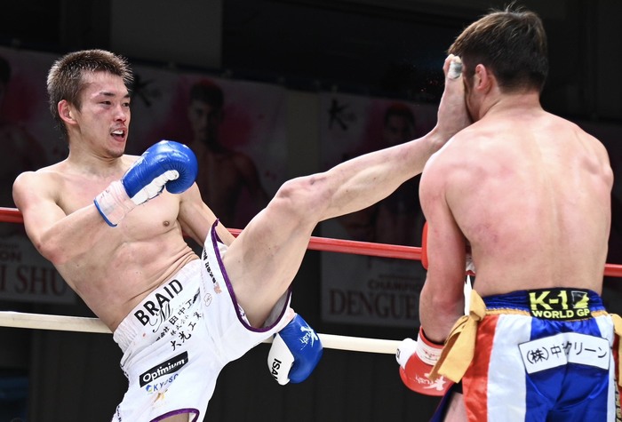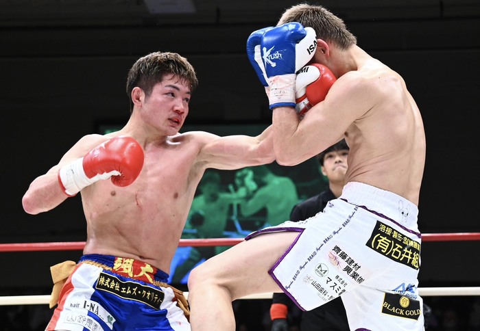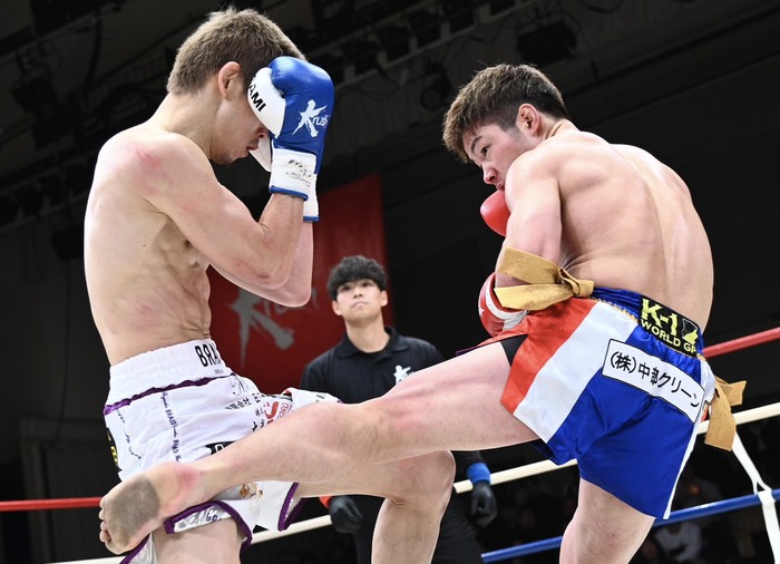 前へ出て攻める天野の打ち終わりを狙っていくバズーカ。ジャブでアウトボクシングするバズーカが左ミドル、左ハイ。天野はどんどん前へ出ていくがバズーカは打ち合いに付き合わず、当てては離れる徹底したアウトボクシング。