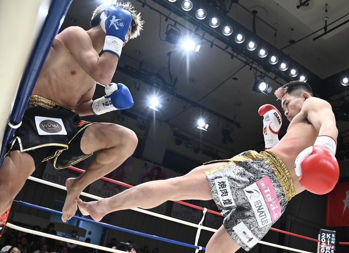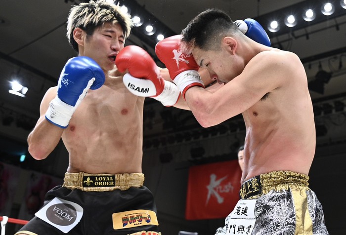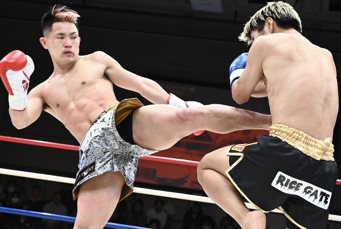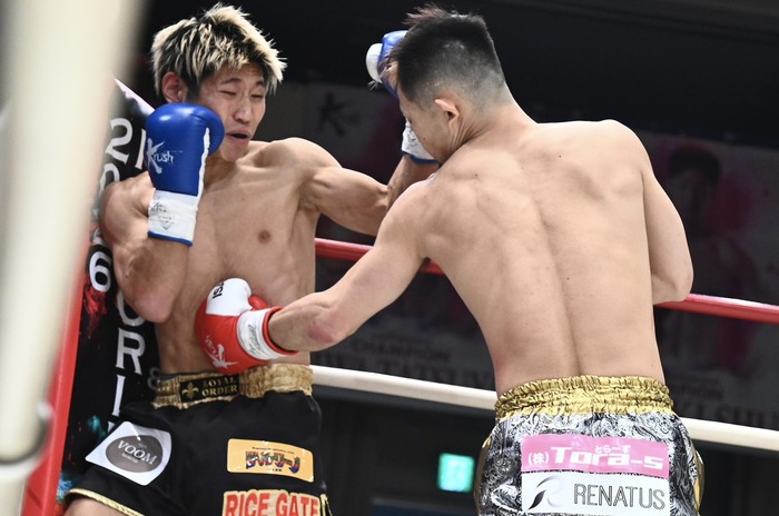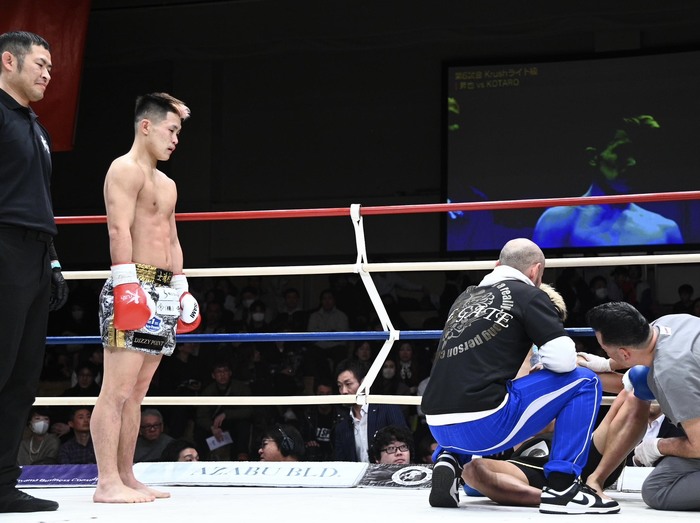 1R、前に出て打ち合いに行く昇也は左フック空振りからのバックハンドブロー。手数は昇也が多いが、KOTAROも右フックやジャブ、前蹴りを当てる。コーナーへ詰めて左ボディを打つ昇也に、KOTAROはすぐに回り込んで右を打つ。