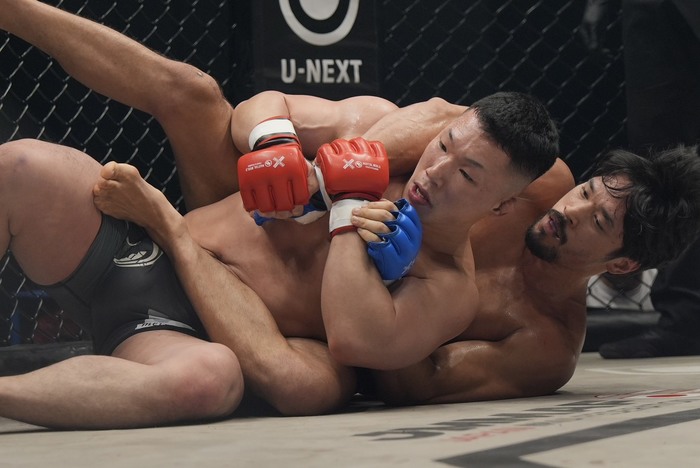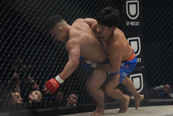 1R、オーソのゴイチに佐藤はサウスポー。ゴイチはスイッチしてサウスポーに。左で飛び込む佐藤。さらに左で前進も組むゴイチが、ケージまでドライブ。シングルレッグに切り替え崩してバッククリンチ。ヒザを突き、崩して両足をフック。ジャッジ3者が10-9でゴイチを支持。