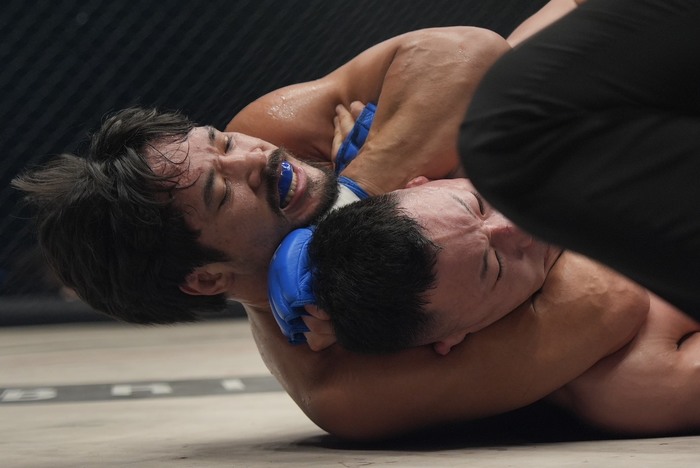 2R、左フックを放つ佐藤。さらに飛び込んでアッパー。ゴイチは跳びヒザ。それを掴んでシングルレッグの佐藤だが、ゴイチがバックに回りバックマウント、リアネイキドチョーク、アゴ上で凌ぐ佐藤に、左腕を喉下に食い込ませてタップを奪った。