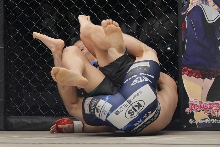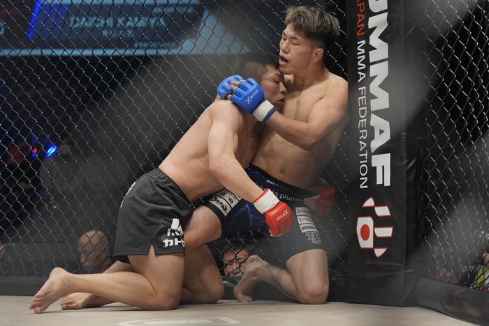 1R、サウスポー構えの神谷にオーソの松岡。ローにケージで詰める神谷は右で差して押し込み。左小手の松岡は頭を側頭部につける、シングルレッグからバッククリンチで左足をかける神谷は両足フックから4の字ロック。背後から細かい鉄槌でホーン。ジャッジ3者10-9で神谷を支持。