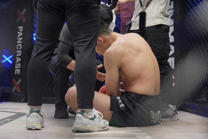 2R、先に組みに行ったのは松岡。シングルレッグからケージに押し込みアンクルピック。左で差す松岡の崩しに右小手の神谷は投げ。右手をマットに着いた松岡はヒジを脱臼か。UFCパントージャと似た形での負傷。神谷のTKO勝ちに。