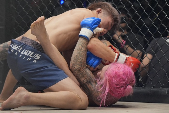 2R、右ローのロイヤルはオーソにスイッチ。サウスポー構えに戻して左インロー。詰める菅は大内刈テイクダウン! ハーフで上に。右はオーバーフックで押さえ込み。細かいパウンド。ロイヤルは立つ動きを見せず。ハーフから腰を切りクローズドガードで再び首を抱えるが、首を放し下のまま。菅はケージに押し込みハーフから右のパウンドでホーン。ジャッジ3者10-9で菅を支持。